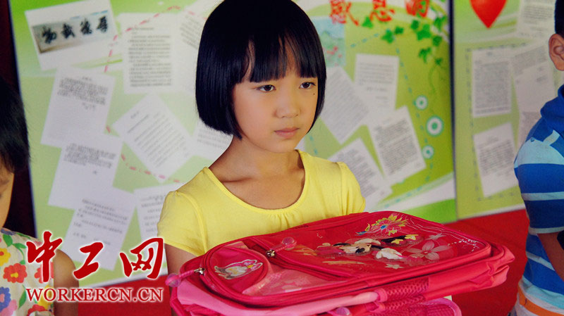 图为受助学生手里拿着新世纪服装商贸城送来的新书包。中工网记者 葛姗 摄