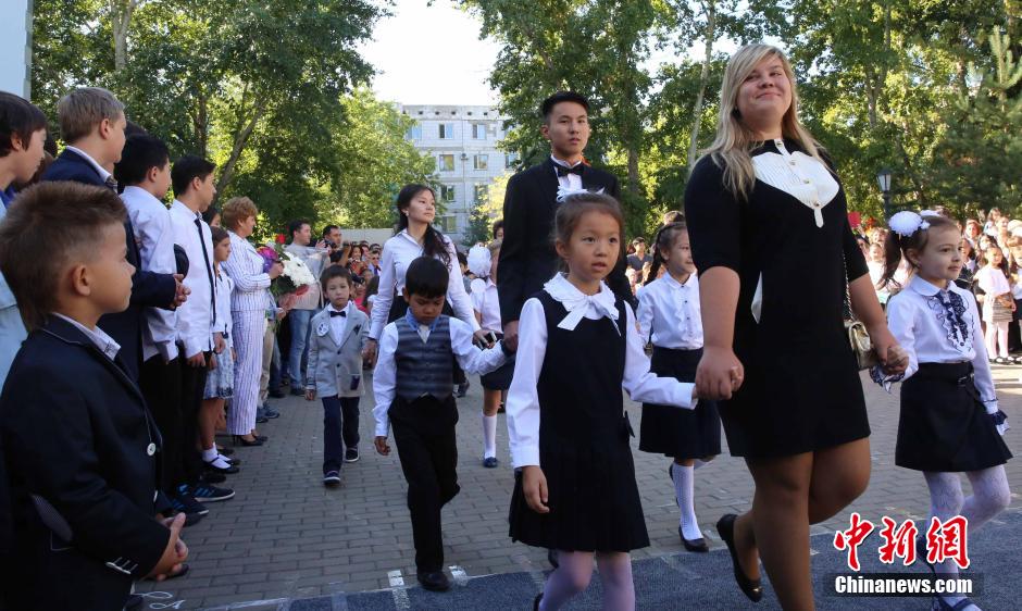 9月1日,在哈萨克斯坦首都阿斯塔纳的一所全日制中学内,高年级学生带领着低年级学生进入学校。当天哈萨克斯坦全国中、小学开学,学生们结束暑假,迎来新学期。 中新社发 王修君 摄