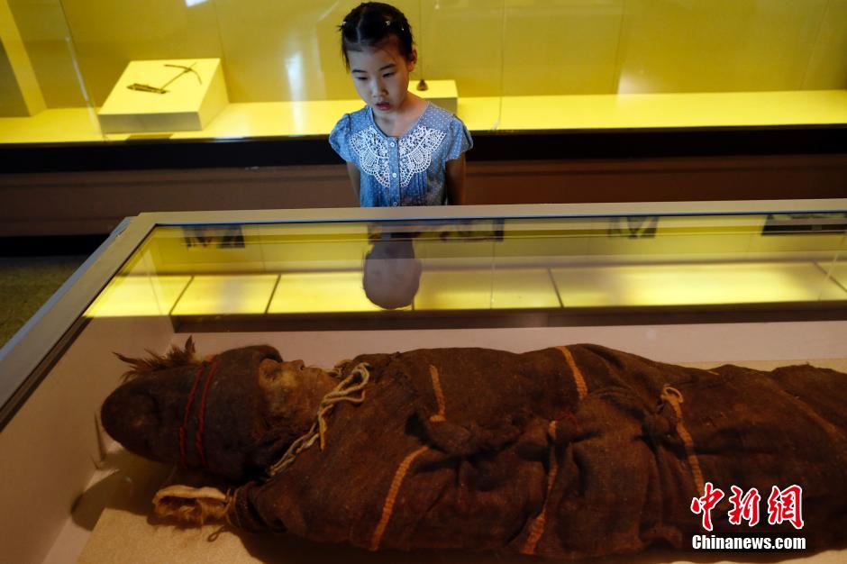 9月3日,第四届中国—亚欧博览会“中外文化展示周”《海上丝绸之路特展》在新疆维吾尔自治区博物馆展出。本次展览以海上丝绸之路为背景,以1996年发现于中国南海海域的南宋时期华光礁Ⅰ号沉船出水文物为主体,汇聚中国水下考古发掘的精品文物,再现中国古代海上丝绸之路的盛况。图为一名女孩看到新疆维吾尔自治区博物馆内的干尸后张大了嘴巴。 中新社发 张浩 摄