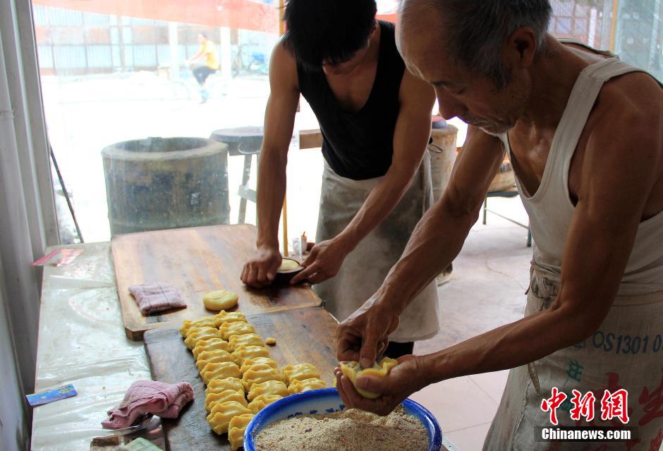 随着社会发展、节奏加快,曾经中秋佳节的回忆珍藏成光阴故事。小学课本中“八月十五月儿圆,爷爷给我打月饼”也湮没在城市的月饼生产流水线。在陕西省北部的绥德县,至今还保留着传统的手工月饼作坊,用家传木质月饼模子做月饼的老常,就是此中代表。图为包馅并倒进模子成型。霍臻 摄