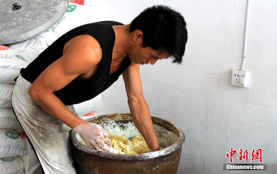 随着社会发展、节奏加快,曾经中秋佳节的回忆珍藏成光阴故事。小学课本中“八月十五月儿圆,爷爷给我打月饼”也湮没在城市的月饼生产流水线。在陕西省北部的绥德县,至今还保留着传统的手工月饼作坊,用家传木质月饼模子做月饼的老常,就是此中代表。图为和面。霍臻 摄