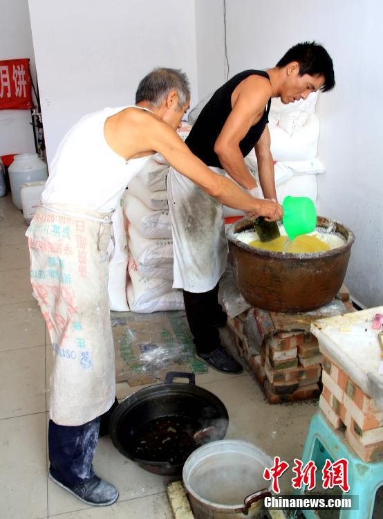 随着社会发展、节奏加快,曾经中秋佳节的回忆珍藏成光阴故事。小学课本中“八月十五月儿圆,爷爷给我打月饼”也湮没在城市的月饼生产流水线。在陕西省北部的绥德县,至今还保留着传统的手工月饼作坊,用家传木质月饼模子做月饼的老常,就是此中代表。图为面粉中倒入植物油与水。霍臻 摄