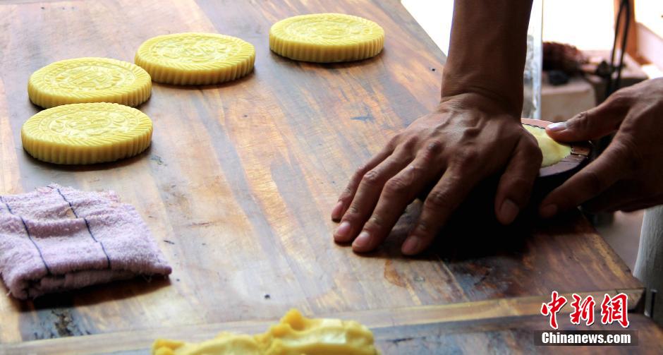 随着社会发展、节奏加快,曾经中秋佳节的回忆珍藏成光阴故事。小学课本中“八月十五月儿圆,爷爷给我打月饼”也湮没在城市的月饼生产流水线。在陕西省北部的绥德县,至今还保留着传统的手工月饼作坊,用家传木质月饼模子做月饼的老常,就是此中代表。图为成型。赵昱 摄