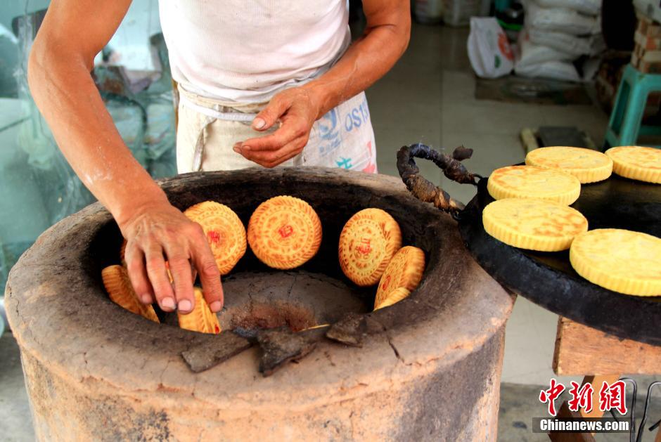 随着社会发展、节奏加快,曾经中秋佳节的回忆珍藏成光阴故事。小学课本中“八月十五月儿圆,爷爷给我打月饼”也湮没在城市的月饼生产流水线。在陕西省北部的绥德县,至今还保留着传统的手工月饼作坊,用家传木质月饼模子做月饼的老常,就是此中代表。图为土炉烘烤。霍臻 摄