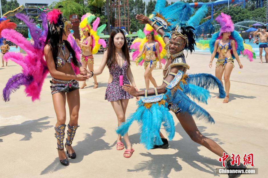 9月4日,广州长隆水上乐园举行了盛大的桑巴热辣辣活动,数十位来自巴西的桑巴女郎为游客带来热辣动感的巴西桑巴舞蹈。游客与女郎一起尽情狂欢,感受巴西的激情热浪。中新社发 刘卫勇 摄