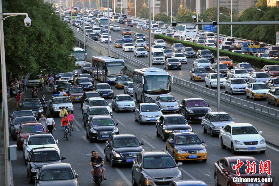 9月5日,中秋节假期前最后一个工作日,北京全市路网陷入严重拥堵状态。据交通部门预测,晚高峰将提前,并出现明显的节前出行特征,即白天路网持续处于拥堵状态。下午由于部分单位可能错峰下班,预计15时起全路网就将达到严重拥堵状态,恢复畅通或将延至19时以后。中新网记者 金硕 摄