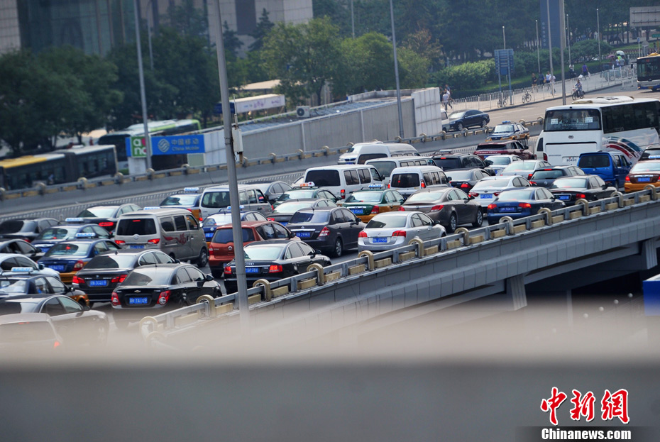 9月5日,中秋节假期前最后一个工作日,北京全市路网陷入严重拥堵状态。据交通部门预测,晚高峰将提前,并出现明显的节前出行特征,即白天路网持续处于拥堵状态。下午由于部分单位可能错峰下班,预计15时起全路网就将达到严重拥堵状态,恢复畅通或将延至19时以后。中新网记者 金硕 摄