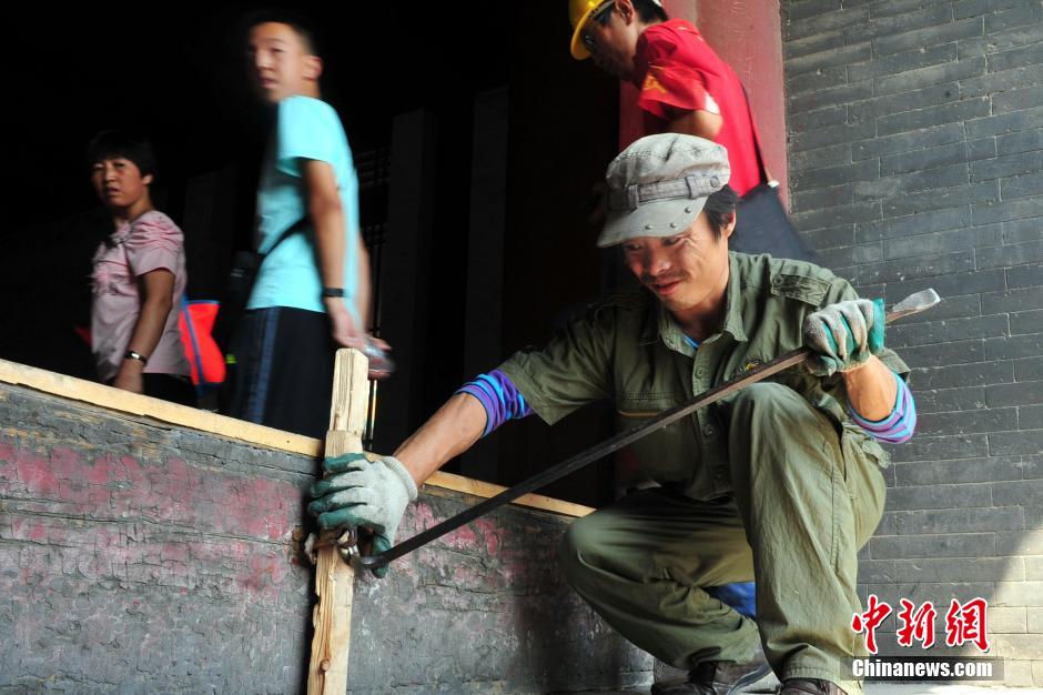 9月5日,工作人员更换门槛。据悉,沈阳故宫博物院参照国内其他世界文化遗产地的通行做法,从8月中旬开始启动了木质门槛保护工程,全部更换了黄铜门槛。中秋期间,观众就可以看到这些铜门槛了。中新社发 于海洋 摄
