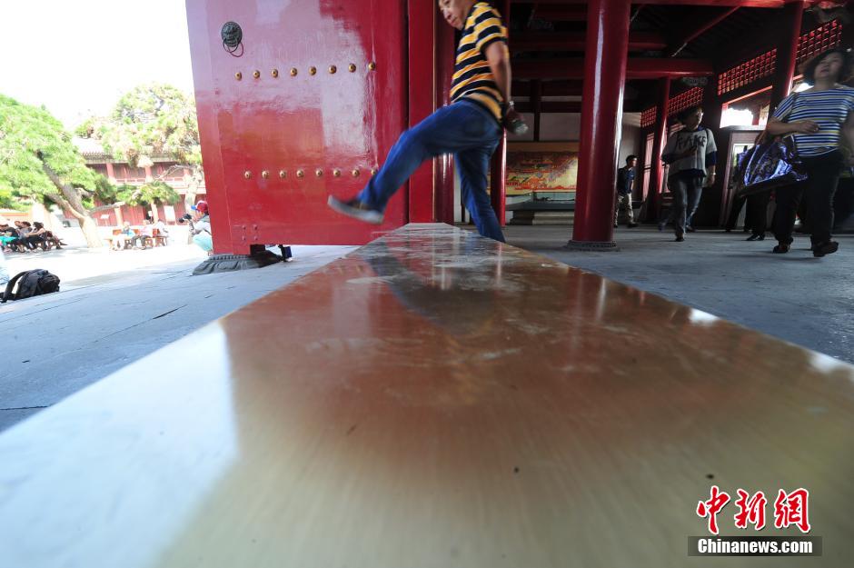 9月5日,市民经过装修后的门槛。据悉,沈阳故宫博物院参照国内其他世界文化遗产地的通行做法,从8月中旬开始启动了木质门槛保护工程,全部更换了黄铜门槛。中秋期间,观众就可以看到这些铜门槛了。中新社发 于海洋 摄