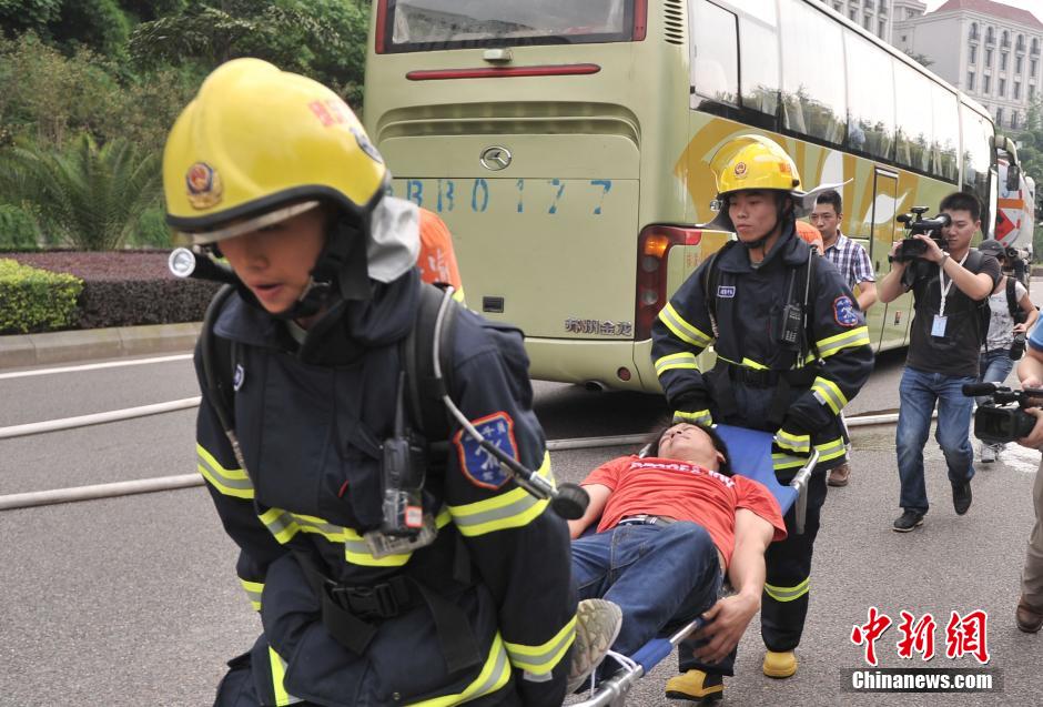 9月5日,为提升重特大交通事故应急处置能力,重庆北部新区公安、消防进行交通事故处置应急演习。“在公路上行驶的大客车突然与运载危险品货车相撞,导致大客车上的乘客多人受伤,同时,另一车辆的危险品泄露”。图为消防官兵现场救援受伤人员。陈超 摄