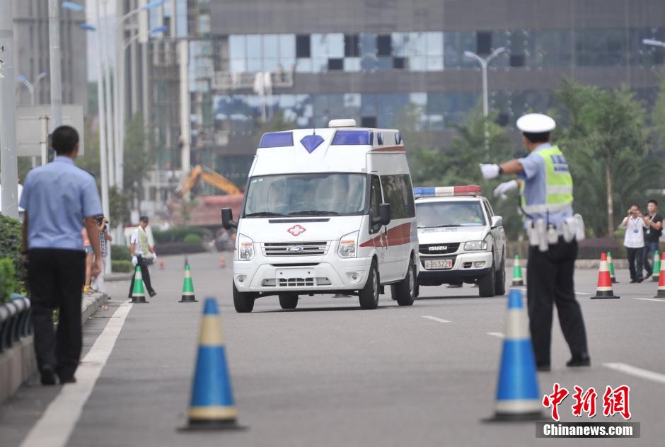 9月5日,为提升重特大交通事故应急处置能力,重庆北部新区公安、消防进行交通事故处置应急演习。“在公路上行驶的大客车突然与运载危险品货车相撞,导致大客车上的乘客多人受伤,同时,另一车辆的危险品泄露”。图为医院急救车紧急到达事发现场。陈超 摄