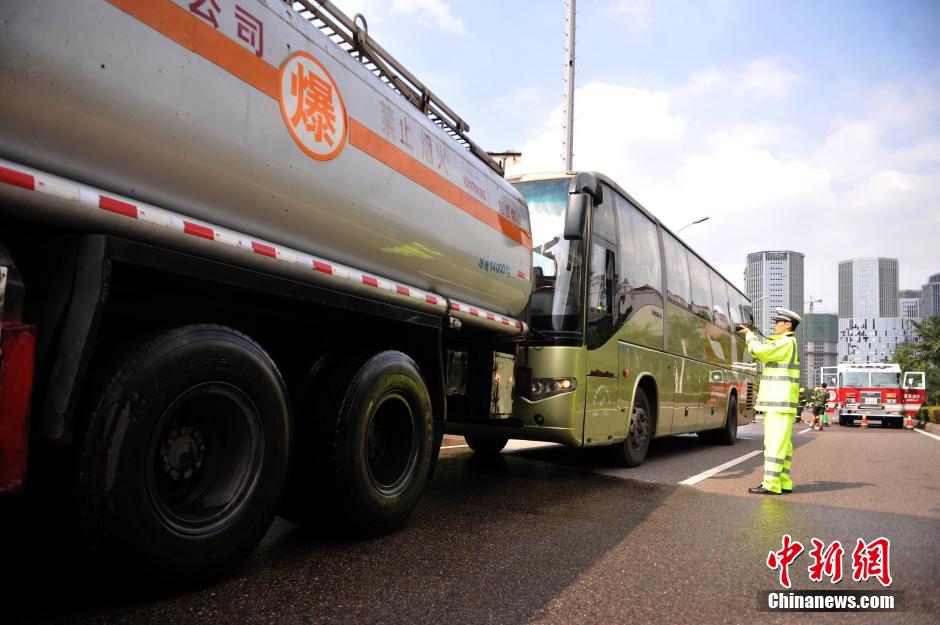 9月5日,为提升重特大交通事故应急处置能力,重庆北部新区公安、消防进行交通事故处置应急演习。“在公路上行驶的大客车突然与运载危险品货车相撞,导致大客车上的乘客多人受伤,同时,另一车辆的危险品泄露”。图为警察现场勘察。陈超 摄