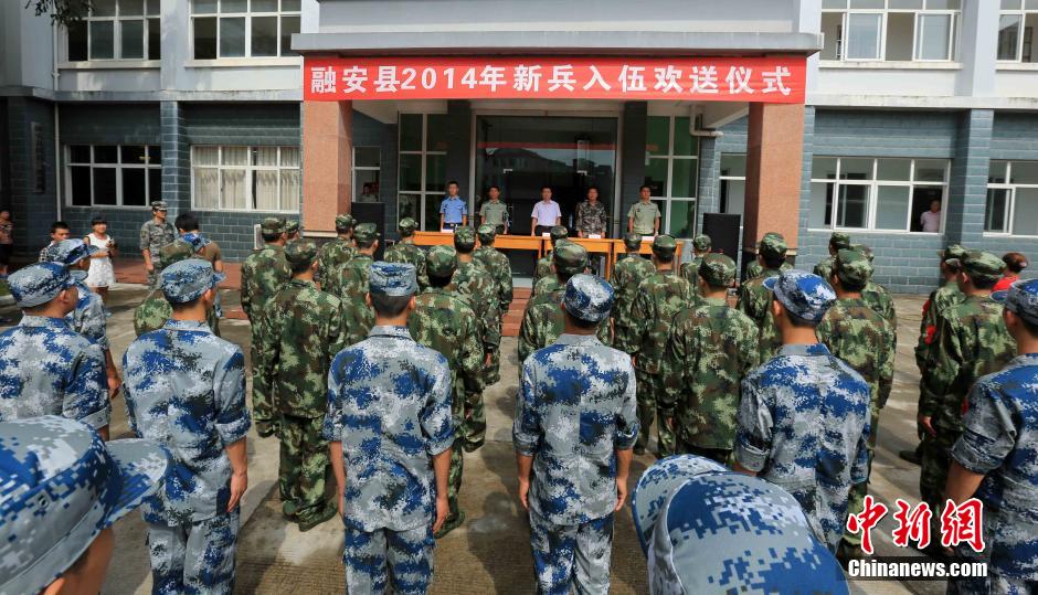 9月5日,在广西柳州市融安县长安镇立新街,当地腰鼓队员夹道欢送新战士赴军营。当日,融安县举行2014年新兵入伍欢送仪式,首批46名新战士带着家乡亲人的祝福和嘱托,启程赴军营为祖国国防事业奉献自己的青春力量。据悉,今日全国各地新兵开始启运,新兵开始奔赴各地军营。谭凯兴 摄