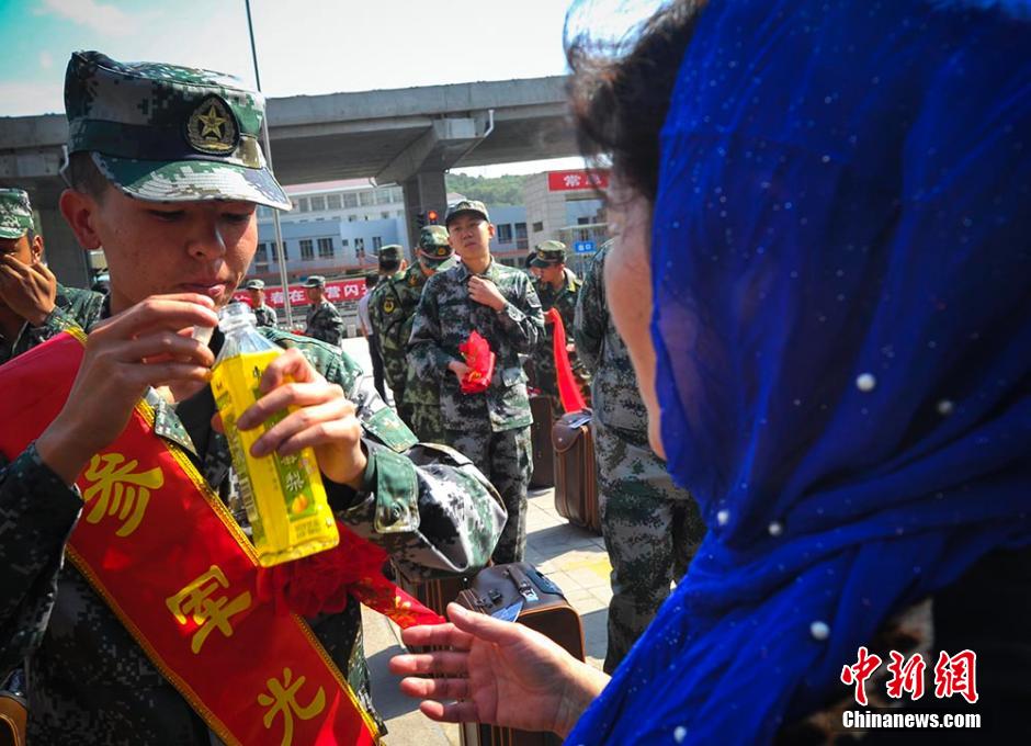 新兵们在太阳下站了很久,一位母亲心疼的为孩子送上饮料。刘新 摄