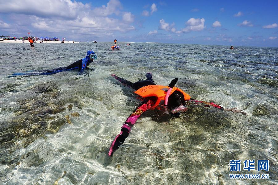 9月3日,游客在西沙原生态岛屿银屿岛体验潜水。 9月3日,西沙迎来9月2日三亚至西沙旅游航线首航的首批200余名游客,游客们在西沙参加沙滩排球、潜水、海钓等活动,充分感受西沙海洋旅游的魅力。新华社发