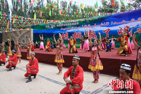 叶城举办第七届核桃采摘节。开幕式上,县乡文艺队员表演了精彩的“叶城赛乃木”。依米努尔 摄