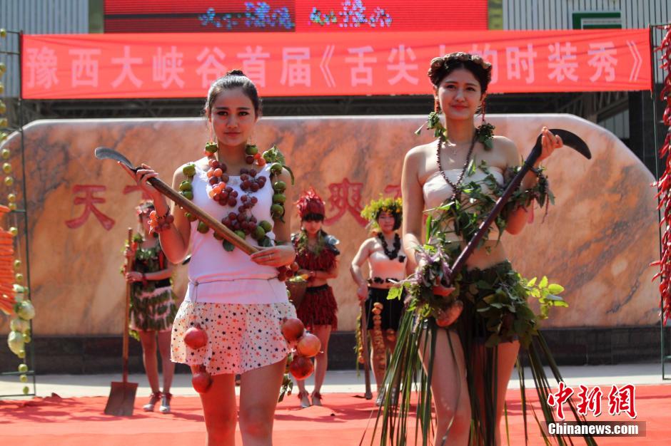 9月5日,导游身披山珍、野果、草药等做成的“时装”进行走秀。当天,三门峡豫西大峡谷上演了一场由土特产制作而成的“舌尖上的时装秀”,辣椒帽、石榴裙、葡萄项链等等纷纷登场亮相,吸引众多游客驻足欣赏。中新社发 王中举 摄