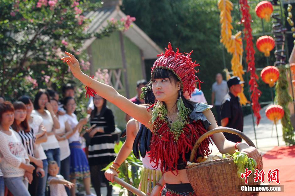 9月5日,导游身披山珍、野果、草药等做成的“时装”进行走秀。当天,三门峡豫西大峡谷上演了一场由土特产制作而成的“舌尖上的时装秀”,辣椒帽、石榴裙、葡萄项链等等纷纷登场亮相,吸引众多游客驻足欣赏。中新社发 王中举 摄