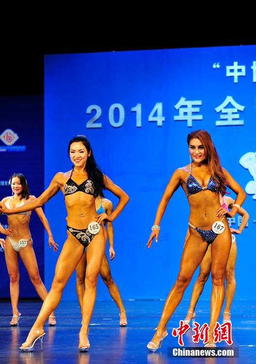 2014年“中博文化杯”全国健身锦标赛上众选手身着比基尼展示魔鬼身材,吸引观众眼球。安源 摄