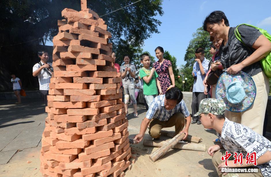 9月7日,以“古村摆塔、闽韵仲秋”为主题的中秋民俗活动在福州仓山“千年古村” 林浦村泰山宫点将台举行。活动现场,当地民众以豆蒿引火,送至事先用砖块和瓦片搭建而成的“品”字形塔口前,顿时该塔成为金光四射的的宝塔。据介绍,烧塔习俗是福州悠久的中秋摆塔习俗的一个重要组成部分,象征着生活红红火火、幸福美满。刘可耕 摄