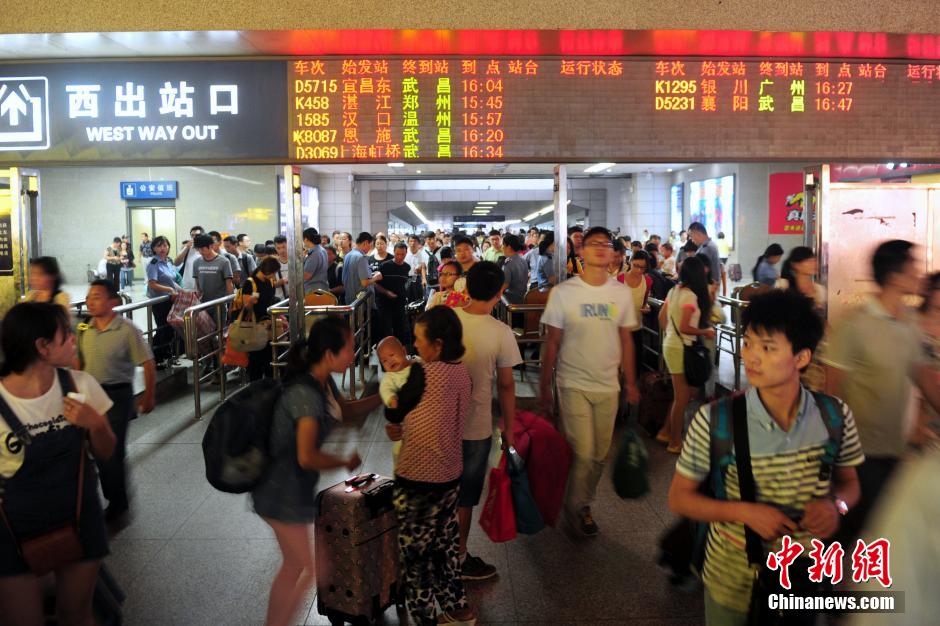 9月5日,武昌火车站旅客排队出站。当日,为期4天的2014年中秋假期铁路旅客运输正式启动。今年中秋假期铁路运输从9月5日起至9月8日共4天,预计全国铁路发送旅客3120万人次,与去年中秋同比增加344万人次,增长12.4%。中新社发 张畅 摄