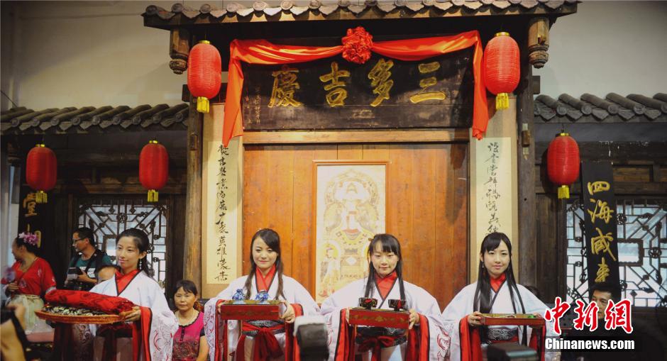 9月8日中秋佳节,“90后”青年李泽伟(刘韵)在重庆千年古镇磁器口,采取传统周制婚前礼向相恋四年的恋人求婚,上演一场凤冠霞帔、花园月圆的浪漫情事。李泽伟和女友相恋之后共同爱上传统文化,此后两人把此爱好变成事业,一起创立了“汉风体验馆——汉韵雅舍”。经过四年的相依相守,李泽伟决定在中秋佳节给女友一个惊喜,按照周礼的三书六礼,用周制婚前礼的方式,向女友求婚。据了解,中国传统婚礼中的“三书六礼”包括纳采、问名、纳吉、纳征、请期、聘书、礼书、婚书,均在这个特别的求婚仪式上得到完整的体现。刘渝 摄