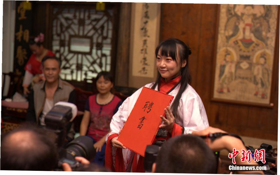 9月8日中秋佳节,“90后”青年李泽伟(刘韵)在重庆千年古镇磁器口,采取传统周制婚前礼向相恋四年的恋人求婚,上演一场凤冠霞帔、花园月圆的浪漫情事。李泽伟和女友相恋之后共同爱上传统文化,此后两人把此爱好变成事业,一起创立了“汉风体验馆——汉韵雅舍”。经过四年的相依相守,李泽伟决定在中秋佳节给女友一个惊喜,按照周礼的三书六礼,用周制婚前礼的方式,向女友求婚。据了解,中国传统婚礼中的“三书六礼”包括纳采、问名、纳吉、纳征、请期、聘书、礼书、婚书,均在这个特别的求婚仪式上得到完整的体现。刘渝 摄