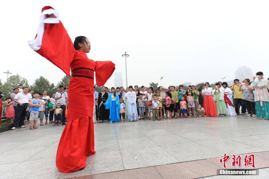 9月8日,河南郑州,一群汉服复兴者在郑州绿城广场开展“中秋祭祀汉家祖先及汉服礼仪展示”活动,现场还开展了猜灯谜,投壶等汉服运动与才艺展示等传统活动,吸引了众多市场围观。中新社发 杨正华 摄