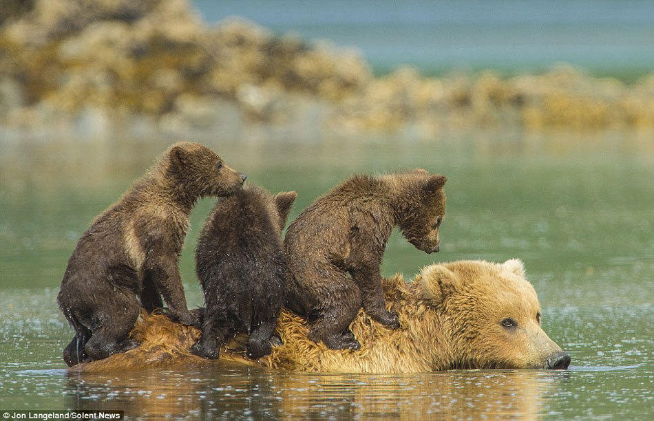 一名名为Jon Langeland的游客在阿拉斯加南部的卡特迈国家公园一河边准备钓鱼时,突然眼前出现了非常搞笑的一幕。一只成年灰熊带着3只熊崽过河,但由于3只小灰熊年龄太小,灰熊妈妈似乎不愿让它们独自过河,所以让它们骑到自己的背上,像一艘小船似的坨着它们过河。Jon Langeland说,“这场面实在是太搞笑了,所以就觉得将这滑稽的场面拍了下来”。