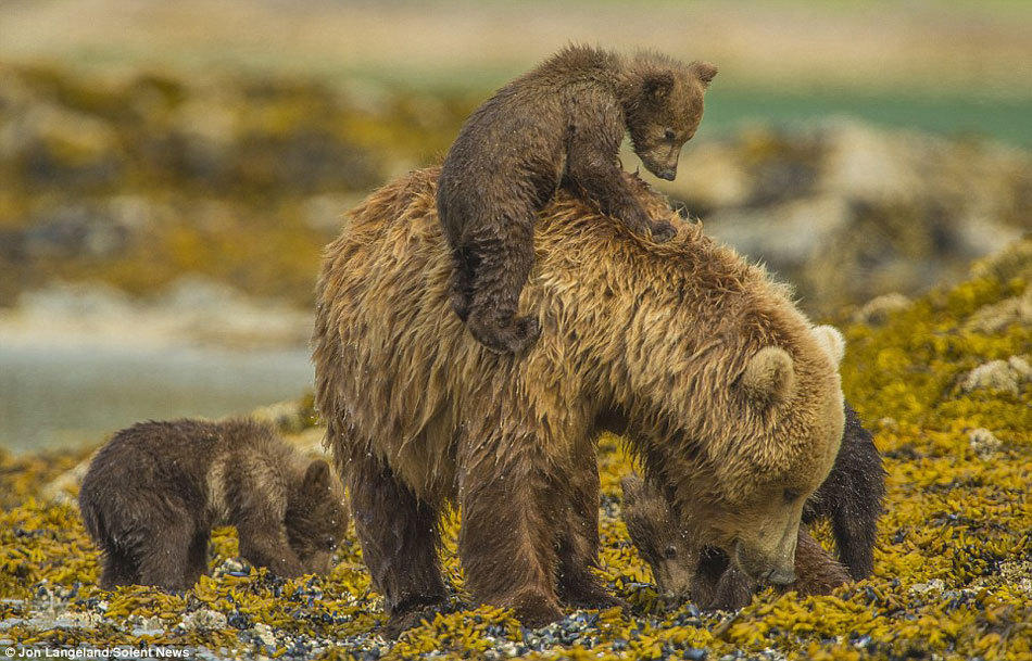一名名为Jon Langeland的游客在阿拉斯加南部的卡特迈国家公园一河边准备钓鱼时,突然眼前出现了非常搞笑的一幕。一只成年灰熊带着3只熊崽过河,但由于3只小灰熊年龄太小,灰熊妈妈似乎不愿让它们独自过河,所以让它们骑到自己的背上,像一艘小船似的坨着它们过河。Jon Langeland说,“这场面实在是太搞笑了,所以就觉得将这滑稽的场面拍了下来”。