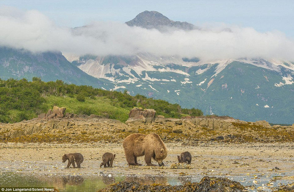 一名名为Jon Langeland的游客在阿拉斯加南部的卡特迈国家公园一河边准备钓鱼时,突然眼前出现了非常搞笑的一幕。一只成年灰熊带着3只熊崽过河,但由于3只小灰熊年龄太小,灰熊妈妈似乎不愿让它们独自过河,所以让它们骑到自己的背上,像一艘小船似的坨着它们过河。Jon Langeland说,“这场面实在是太搞笑了,所以就觉得将这滑稽的场面拍了下来”。