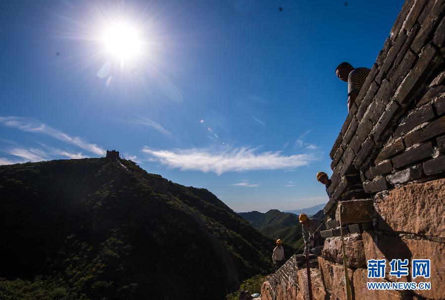 9月10日,工人们在进行延庆县八达岭镇帮水峪段长城修葺工作。