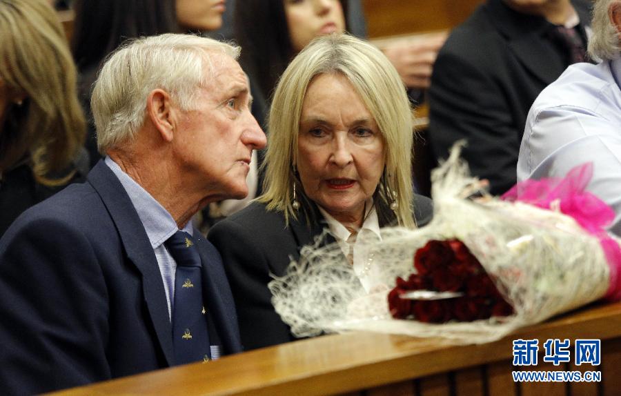 9月11日,被害人斯滕坎普的母亲(右)在庭审现场等待开庭。 当日,南非“刀锋战士”皮斯托瑞斯涉嫌杀害女友案将在比勒陀利亚高等法院宣判。新华社/法新