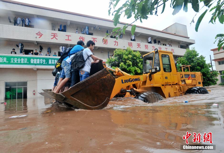 9月13日,在四川广安市机电工业职业技术学校,学校正在用装载机转移学生。9月11日16时至13日16时,四川广安遭遇今年最强暴雨袭击,出现区域性大暴雨。此次降雨导致城区多处内涝,多个乡镇受灾。 中新社发 黄辉 摄