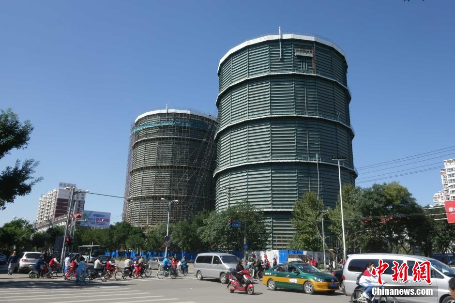 9月15日,呼和浩特地标“大绿罐”其中一个已经搭满拆除的脚架。据悉,两个大绿罐分别使用21年和14年,内部储存天然气,曾有人大代表提出两座天然气大罐一旦发生事故形成爆炸,对方圆3公里以内的地域形成600吨当量的TNT炸药的效果。刘文华 摄