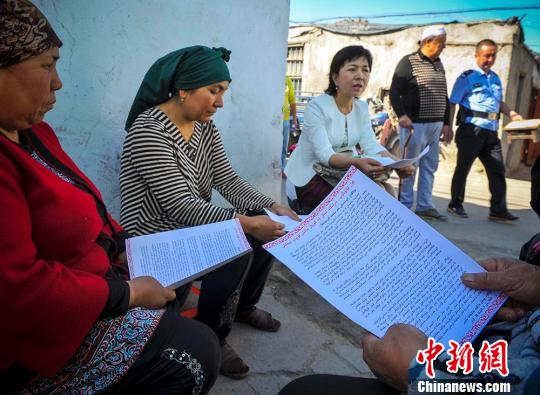 宣讲员穆巴拉克走进乌鲁木齐安居乐社区,为社区居民进行民族团结、政策法规、反极端宗教思想等方面的宣传。 刘新 摄
