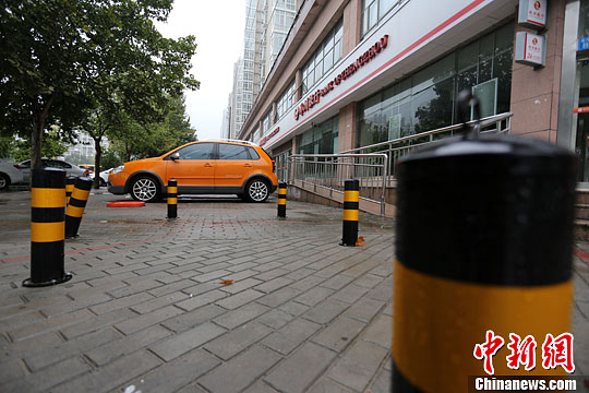 9月15日,位于郑州市黄河南路与商鼎路交叉口附近的郑州银行门前的非机动车停车区域的圆型地锁。杨正华 摄