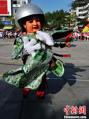 9月15日,由台湾金门县政府副县长吴友钦带领的金门忠义电音团“电音三太子”在泰宁山地户外运动国际挑战赛开幕式上表演,受到市民和运动员们的欢迎。张斌 摄