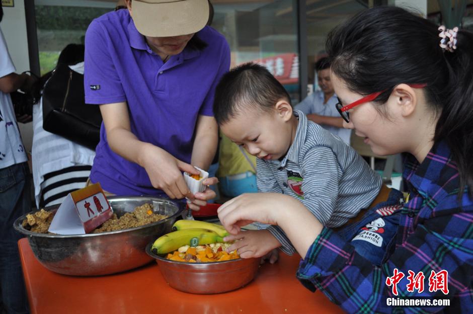 9月3日,无锡10组热爱动物的家庭来到无锡动物园,为园内的动物们手工DIY“动物月饼”。在动物园内,小朋友们将小老虎的鲜肉月饼、鹦鹉的瓜子月饼、节尾狐猴的水果月饼、大象巨型青草月饼、黑熊的杂粮月饼等一一备好,在家长跟动物园工作人员的陪同下一起喂食动物,为小动物们过中秋节。孙权 摄