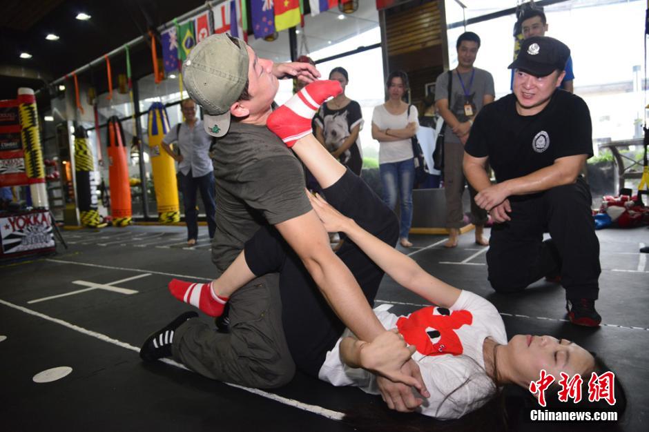 昆山警方结合女性的特点将防身术中的一些精髓提炼出来,用最简单的动作施展出来,达到一招制敌,迅速脱离险境的效果。9月3日,昆山市公安局战训大队的张亮教官在市区商业中心现场传授女子防身术的技巧。周佳磊 摄