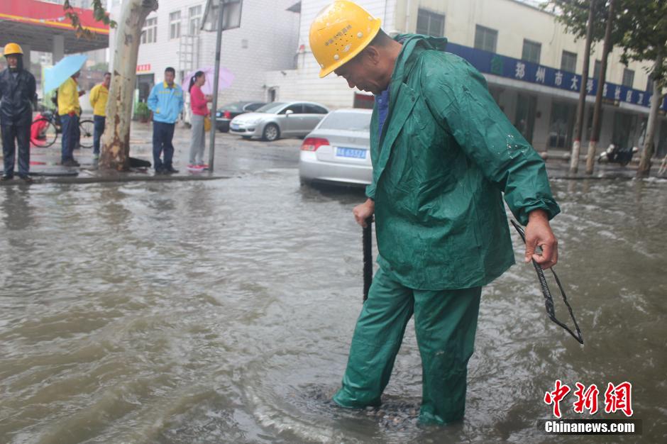 9月16日,河南各地连绵的阴雨依旧未能消停,诸多城市道路出现不同程度积水,驾车出行的市民无奈逆水前行,放慢速度的车辆仿佛在“水路”上游泳。不绝的秋雨令网友直呼:“白素贞,住手吧……许仙真的不在河南住。”图为郑州陇海路与交通路交叉口积水蔓延,工作人员正在抓紧疏通排水口。马义恒 摄