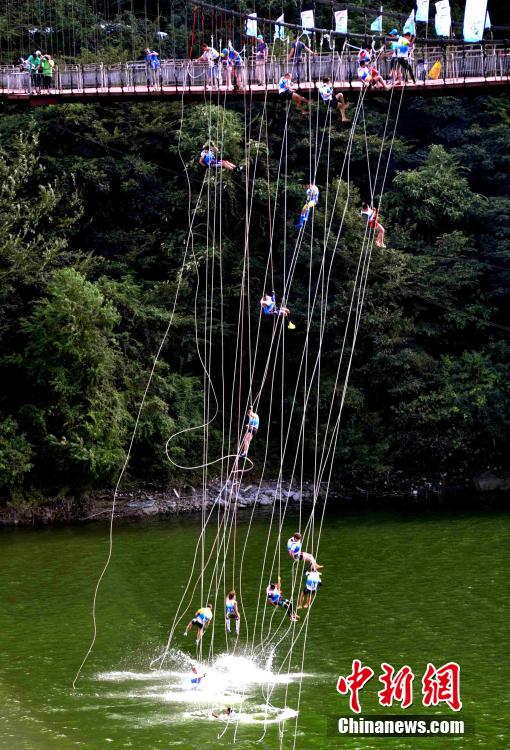 9月16日,参赛运动员进行索桥速降比赛,犹如“天降神兵”。当日,“2014中国丹霞(泰宁)山地户外运动国际挑战赛”在“水上丹霞”美誉的福建泰宁大金湖景区进行,独具的丹霞地貌让参赛的中外选手在比赛中感受到别样的风景。竞赛设置了桥降、皮划艇、山地车、越野跑等5个户外运动项目,赛程总长55公里。张斌 摄