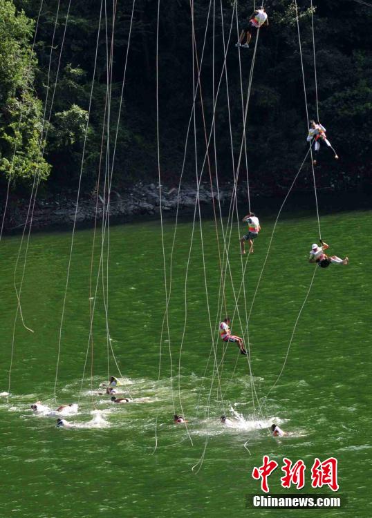 9月16日,参赛运动员进行索桥速降比赛,犹如“天降神兵”。当日,“2014中国丹霞(泰宁)山地户外运动国际挑战赛”在“水上丹霞”美誉的福建泰宁大金湖景区进行,独具的丹霞地貌让参赛的中外选手在比赛中感受到别样的风景。竞赛设置了桥降、皮划艇、山地车、越野跑等5个户外运动项目,赛程总长55公里。张斌 摄