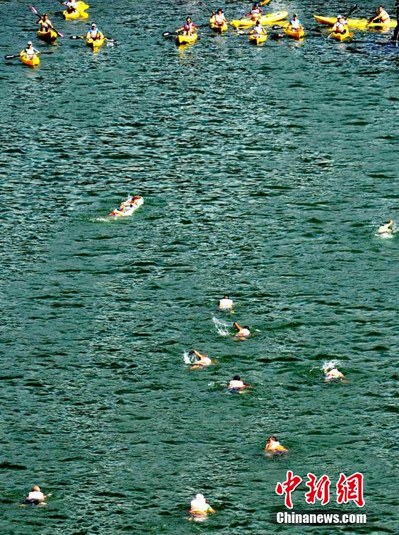9月16日,参赛运动员进行索桥速降比赛,犹如“天降神兵”。当日,“2014中国丹霞(泰宁)山地户外运动国际挑战赛”在“水上丹霞”美誉的福建泰宁大金湖景区进行,独具的丹霞地貌让参赛的中外选手在比赛中感受到别样的风景。竞赛设置了桥降、皮划艇、山地车、越野跑等5个户外运动项目,赛程总长55公里。图为运动员进行水上游泳比赛。张斌 摄