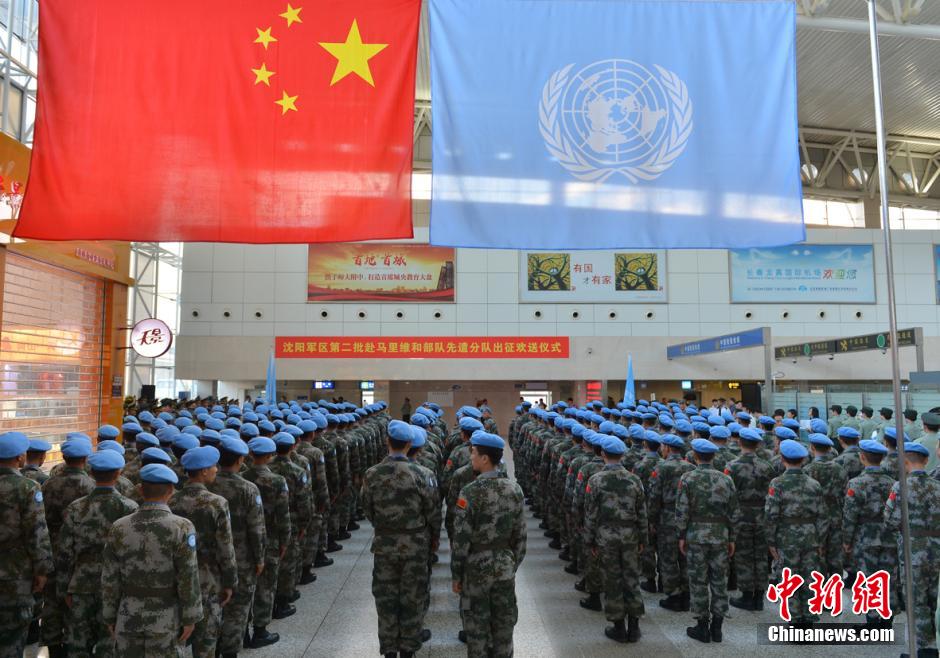 9月16日,沈阳军区在长春龙嘉国际机场隆重举行仪式,欢送中国第二批赴马里维和部队先遣梯队启程,他们将乘专机飞赴马里加奥任务区接替首批维和部队,继续执行维和任务。中国第二批赴马里维和部队分别由工兵分队、警卫分队和医疗分队联合组成。工兵分队155人以16集团军某工兵团为主抽组,警卫分队170人以16集团军某红军团为主抽组,医疗分队70人以沈阳军区联勤部所属医院为主抽组。第二批赴马里维和部队共计395人,将于9月25日全部抵达马里,开始为期8个月左右的国际维和任务。中新社发 杨再新 摄