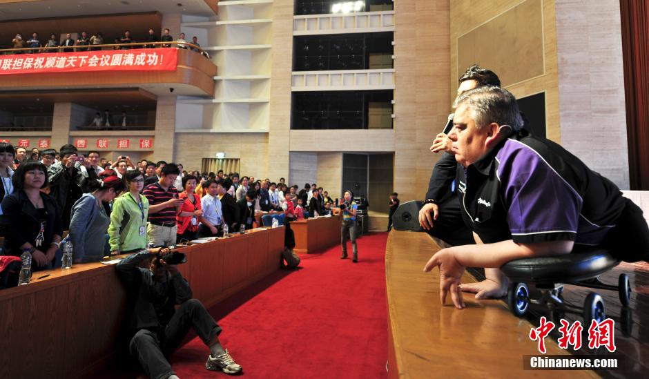 9月17日,“无腿超人”与观众交流人生感悟。中新社发 张勇 摄