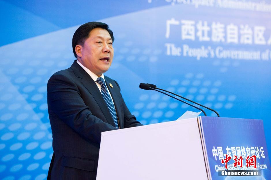 9月18日下午,首届中国—东盟网络空间论坛在广西南宁开幕。中央网络安全和信息化领导小组办公室主任、国家互联网信息办公室主任鲁炜出席论坛开幕式并发表主旨演讲,中共广西壮族自治区委员会书记彭清华出席并致辞,缅甸通信与信息技术部部长吴妙亨出席并发表主旨演讲。图为鲁炜发表主旨演讲。洪坚鹏 摄