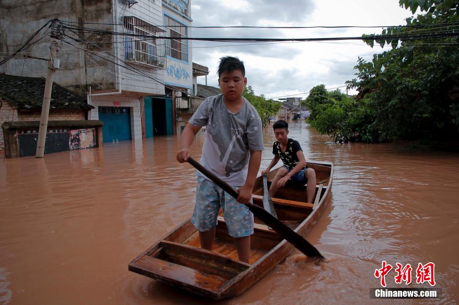 受15号台风“海鸥”的影响,广西崇左市宁明县9月15日20时至17日16时普降大到暴雨,导致洪水暴涨。18日,广西宁明县驮龙片区被淹水深达2-3米。据当地防汛抗旱指挥部介绍,截至18日上午11时,全县受灾人口达35万人,民房倒塌40间,转移人口5297人,直接经济损失达4.94亿元人民币。图为受灾民众在洪水中行船。中新社发 宋汉涛 摄