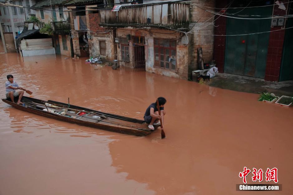 受15号台风“海鸥”的影响,广西崇左市宁明县9月15日20时至17日16时普降大到暴雨,导致洪水暴涨。18日,广西宁明县驮龙片区被淹水深达2-3米。据当地防汛抗旱指挥部介绍,截至18日上午11时,全县受灾人口达35万人,民房倒塌40间,转移人口5297人,直接经济损失达4.94亿元人民币。图为受灾民众在洪水中行船。中新社发 宋汉涛 摄