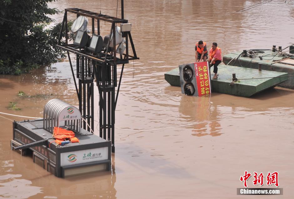 9月19日,长江洪峰过境重庆主城,朝天门码头被淹。朝天门广场上空无一人,由于洪水水位过高,已禁止游客进入,只有几名商户老板坐在朝天门码头梯坎上,旁边堆放着从商店搬出来的一部分货物,久久不愿离去,都在等待洪水退去。据一商户老板介绍:“由于洪水来的太急,很多商店的货物还未来得及搬离,现在还泡在水中,也有些货物随着洪水冲走了,现在只希望把损失降至最低”。陈超 摄